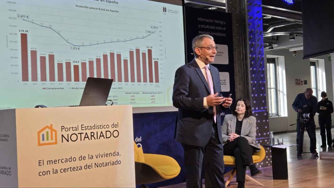 Explicó que en 2007 se vendieron 618.000 pisos —790.000 viviendas si se incluyen las casas—, mientras que en la actualidad la cifra ronda las 540.000 operaciones. El precio medio por metro cuadrado ha pasado de 2.077 euros en 2007 a 2.156 euros en 2025, superando por primera vez el nivel previo a la crisis.
